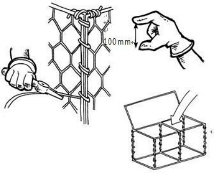 2、把每個(gè)旁邊面立起來,組合成一個(gè)網(wǎng)箱狀。網(wǎng)箱的每一個(gè)外表都有較粗的邊絲,在網(wǎng)面的邊角把這些重合的粗邊絲相互擰在一起。這些擰在一起的邊絲在邊角和綁絲重合。