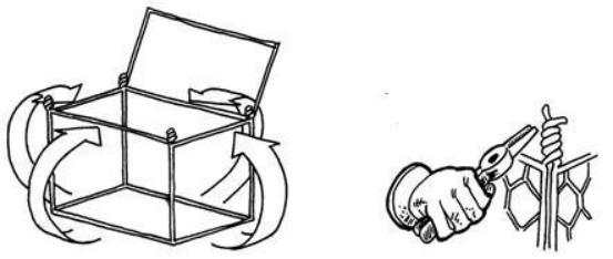 2、把每個(gè)旁邊面立起來,組合成一個(gè)網(wǎng)箱狀。網(wǎng)箱的每一個(gè)外表都有較粗的邊絲,在網(wǎng)面的邊角把這些重合的粗邊絲相互擰在一起。這些擰在一起的邊絲在邊角和綁絲重合。